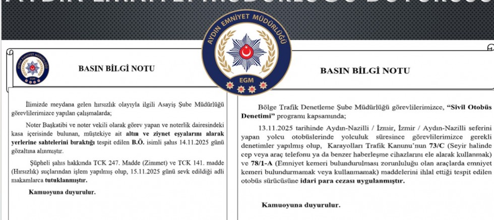 13.11.2025 tarihinde Aydın-Nazilli / İzmir, İzmir / Aydın-Nazilli seferini yapan yolcu otobüslerinde yolculuk süresince görevlilerimizce gerekli denetimler yapılmış olup, Karayolları Trafik Kanunu’nun 73/C (Seyir halinde cep veya araç telefonu ya da benzer haberleşme cihazlarını ele alarak kullanmak) ve 78/1-A (Emniyet kemeri bulundurulması zorunluluğu olan araçlarda emniyet kemeri bulundurmamak veya kullanmamak) maddelerini ihlal ettiği tespit edilen otobüs sürücüsüne idari para cezası uygulanmıştır.