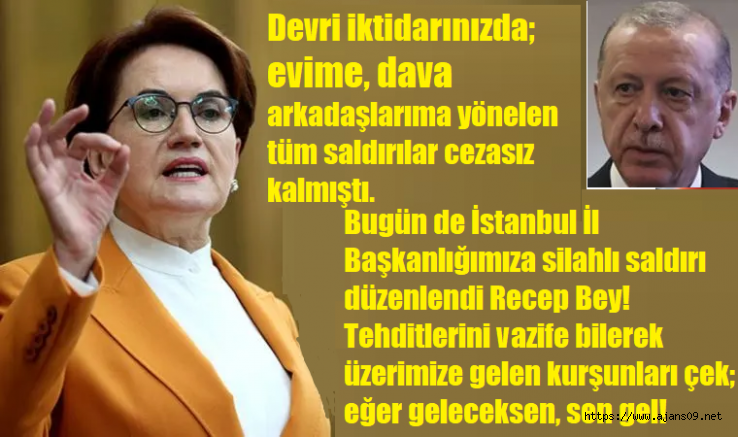 Saldırının ardından açıklamalarda bulunan İYİ Parti lideri Meral Akşener, "Devri iktidarınızda; evime, dava arkadaşlarıma yönelen tüm saldırılar cezasız kalmıştı. Bugün de İstanbul İl Başkanlığımıza silahlı saldırı düzenlendi Recep Bey! Tehditlerini vazife bilerek üzerimize gelen kurşunları çek; eğer geleceksen, sen gel!" ifadelerini kullandı.
