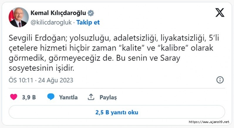 "Sevgili Erdoğan; yolsuzluğu, adaletsizliği, liyakatsizliği, 5’li çetelere hizmeti hiçbir zaman “kalite” ve “kalibre” olarak görmedik, görmeyeceğiz de. Bu senin ve Saray sosyetesinin işidir" diyen Kılıçdaroğlu, "22 yıldır Cumhuriyet Halk Partisi’ni kendine ve Saray sosyetesine benzetmeye çalıştığını söylüyorsun… Boşuna uğraşma; devleti soyanların, uyuşturucu baronlarına hizmet edenlerin, hudutları namus olmaktan çıkaranların asla CHP’de yeri yoktur, olmaz da" ifadelerini kullandı.
